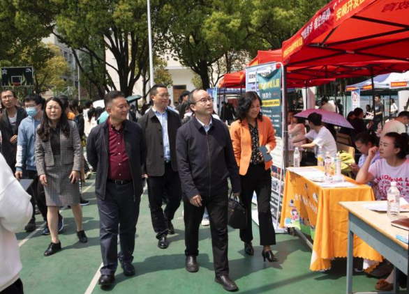 贵阳市人大常委会二级巡视员袁云龙(左二)、安顺学院党委书记罗荣彬(中)一行亲临招聘会现场