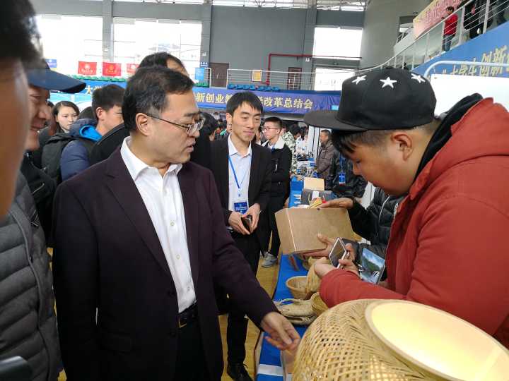陈鸣明副省长一行来到安顺学院展台前,仔细观看参展展品并详细询问,对我校学生创新创业团队给予赞许,并勉励他们再接再厉,争取更多更好的创新产品。(文/图:教务处 丁俊锋)