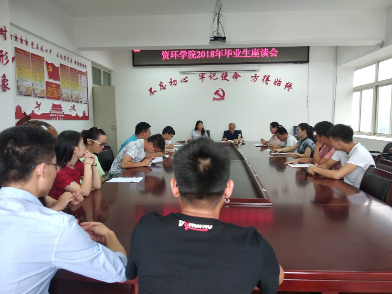 2018年7月3日上午,资环学院在学院办公室召开毕业生座谈会。2018届毕业生代表、学院领导、毕业班班主任、教研室主任、学生口老师、实验管理科、 教务科及办公室相关老师参会。会议由资环学院党总支副书记叶玉莲主持。