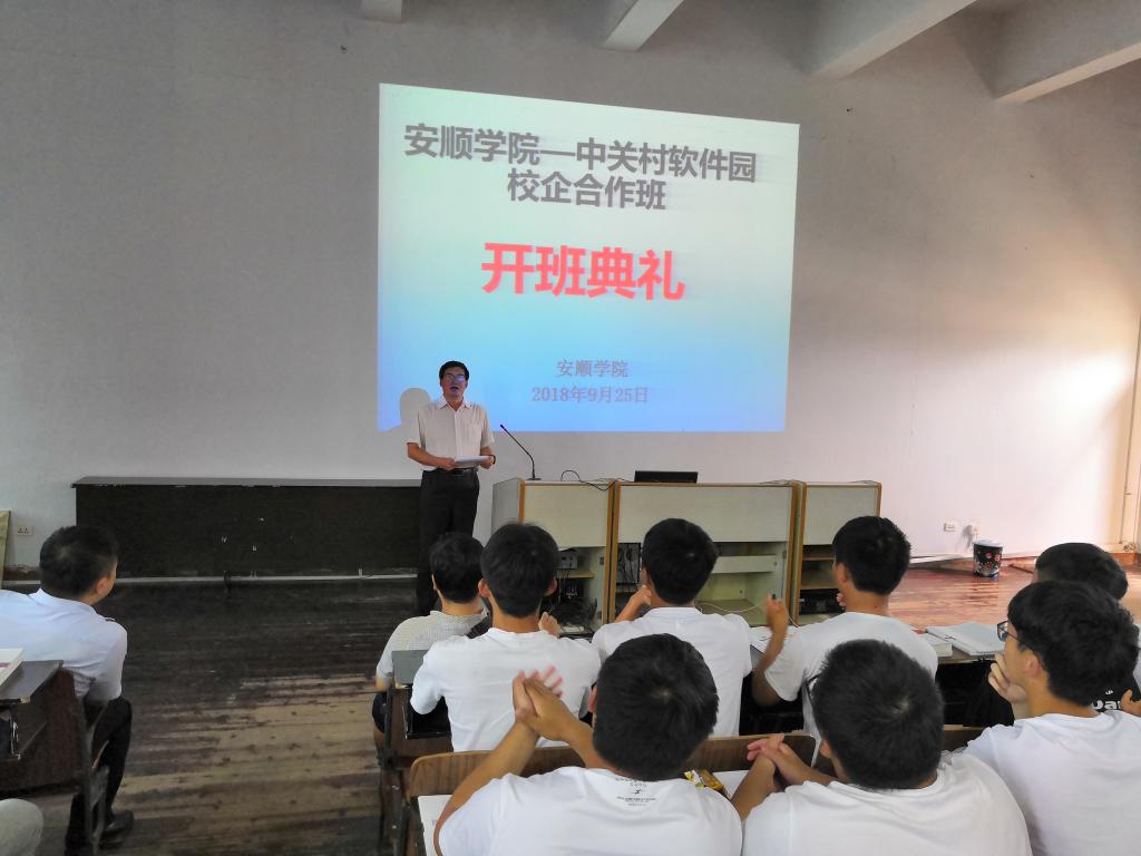 9月25日下午,安顺学院—中关村软件园合办专业2018级新生开班典礼在951教室举行,安顺学院数理学院院长(兼电子与信息工程学院院长)庄中文教授、中关村智酷双创人才服务股份有限公司教育发展中心专业实验室系统研发总监朴睿、安顺学院电子与信息工程学院副院长闫万珺教授、杨丽副教授参加开班典礼。