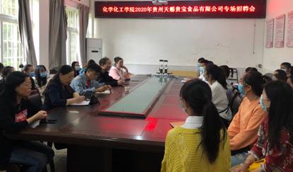 2020年5月12日上午10点,化学化工学院在会议室举办了贵州天赐贵宝食品有限公司2020年专场招聘会,化学化工学院党委书记杨莉莉、化学化工学院院长施渺筱,化学化工学院专职副书记张红霞,学生科教师秦兰、2016级化学工程与工艺专业、2016级化学专业、2016级食品质量与安全专业学生参加了本次招聘会。