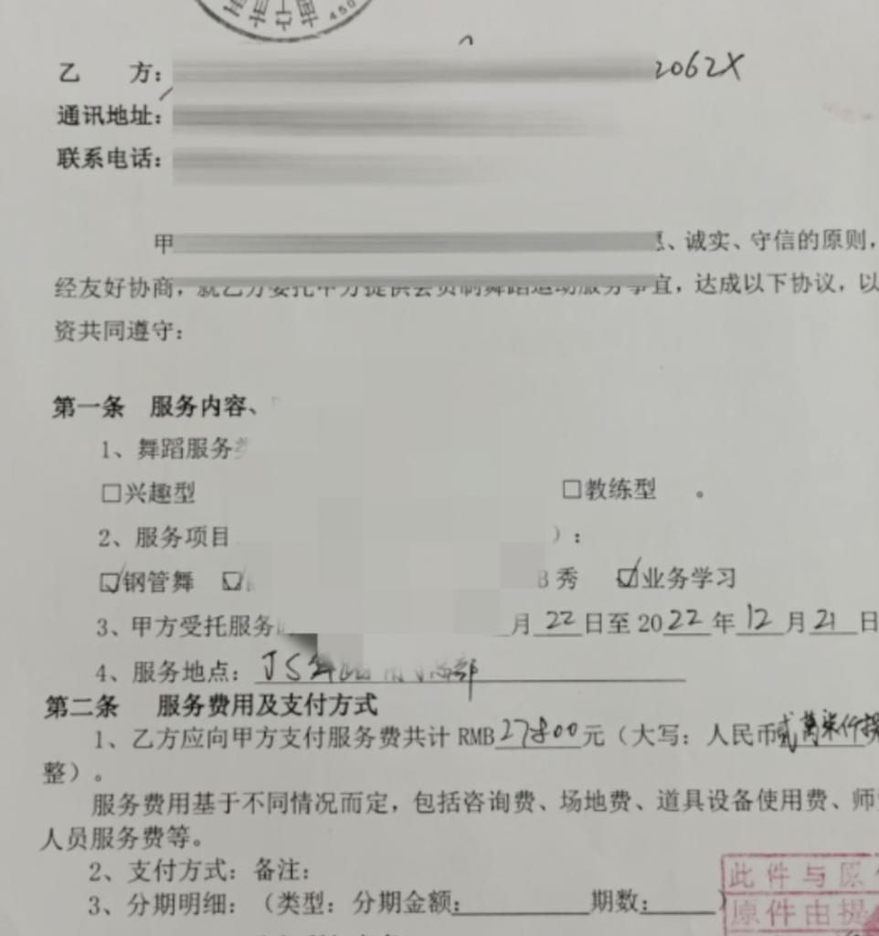 记者通过内部人士拿到一份该舞蹈培训机构的合作协议。根据协议,总部在广东东莞的这家培训机构在各地招募代理商并收取费用,代理商需要继续发展加盟商,收取的加盟费与总部按比例提成,加盟商可以使用该舞蹈机构的品牌,但经营中产生的债务、纠纷等由加盟商自行承担。