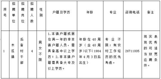 本次招聘采取现场报名的方式,报名地点为木瓜镇党政办公室,联系人:李红虎 15186104343。