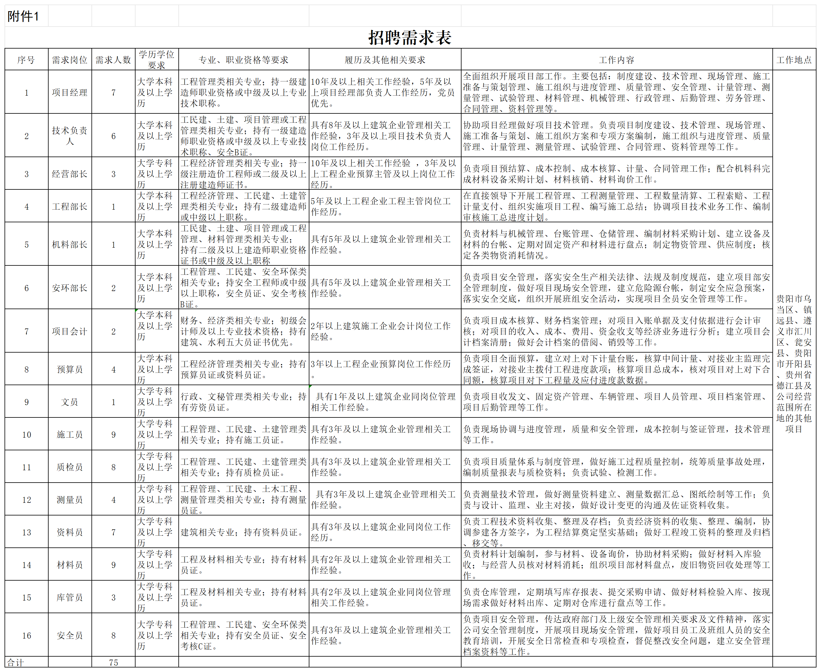 此次招聘涉及16个岗位,计划招聘75人(详见附件1)。