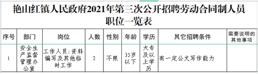 附:艳山红镇人民政府2021年第三次公开招聘劳动合同制人员职位一览表