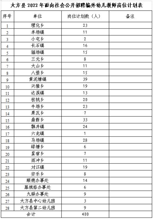 为加强学前教育师资队伍建设,提高学前教育普及普惠水平,经县人民政府同意,拟面向社会公开招聘400名编外幼儿教师。为做好本次招聘工作,特制定《大方县2022年面向社会公开招聘编外幼儿教师实施方案》(以下简称《实施方案》)。一、公开招聘的原则及程序(一)坚持因事设岗、按岗招聘原则。(二)坚持德才兼备、任人唯贤原则。(三)坚持公开、平等、竞争、择优原则。招聘工作按照制定招聘计划、发布招聘公告、报名、资格审查、笔试、体检、政审、公示、签订劳动合同等程序进行,实行公开报考条件、公开考试程序、公开考试结果“三公开”制度。二、招聘职位招聘职位详见《大方县2022年面向社会公开招聘编外幼儿教师岗位计划表》(附件1,以下简称《岗位表》)。三、招聘对象及报考条件(一)具有中华人民共和国国籍。(二)拥护中华人民共和国宪法,拥护中国共产党的领导,热爱社会主义,具有良好的政治素质和品行,具有为人民服务的思想,遵纪守法。(三)年龄在18周岁及以上(2004年5月11日及以前出生),40周岁及以下(1981年5月12日及以后出生)。(四)大专及以上毕业学历,具有幼儿园及以上教师资格证。(五)具有正常履行应聘职位职责的身体条件。(六)具备拟报考职位所需的其他资格条件。以下人员不得报考:(一)不能坚持党的基本理论和基本路线,在重大政治问题上不能与党中央保持一致的。(二)截至2022年4月26日,仍在大方县服务的幼儿志愿者。(三)截至2022年4月26日仍在读的全日制非2022届毕业生。(四)曾因犯罪受过刑事处罚的人员,受处分期间或正在接受纪委监委、司法机关立案调查未结案的人员。(五)曾被开除公职或在机关(含参照公务员法管理单位)、事业单位被辞退未满5年的人员。(六)在各级公务员招录或事业单位招聘考试中被认定有舞弊等严重违反纪律行为且仍在不得报考期限内的人员。(七)被依法列为失信联合惩戒对象的人员。(八)不符合招聘对象、报考条件的人员。(九)有法律、法规规定不得聘用人员以及师德师风方面存在问题的人员。四、信息发布、报名及资格审查(一)发布招聘公告时间招聘信息于2022年4月26日在大方教育网微信公众号上发布。(二)报名本次公开招聘采取现场报名方式进行。1.报名时间:2022年5月11日至2022年5月13日,上午9∶00—12:00,下午2:30—17∶30,逾期不再办理报名手续。2.报名地点:大方县青少年活动中心(大方县奢香大道中段奢香公园内)。3.通过报名资格审查人员收取考务费100元/人。4.报名所需资料(1)《大方县2022年面向社会公开招聘编外幼儿教师报名表》(附件2,以下简称《报名表》)1份,考生自行在大方教育网微信公众号下载填写打印(《报名表》只收打印表),并在“考生签名”处亲笔签名,贴上考生近期同底免冠正面一寸免冠彩色照片,并交相同电子照片(照片格式JPEG,照片尺寸为宽130像素,高170像素,分辨率150,以“姓名连着身份证号”命名,中间不留存空格)。(2)有效《居民身份证》(含《临时居民身份证》)原件及复印件1份、《教师资格证书》原件及复印件1份、《毕业证书》原件及复印件1份(2022届毕业生可持《就业推荐表》或学校出具的证明原件及复印件1份)。(3)应聘职位要求的其他材料原件及复印件。(三)资格审查报考人员须认真阅读《实施方案》中所规定的招聘条件和《职位表》中的各项要求,确定自己符合招聘条件之后再进行填报。否则,错报、误报和瞒报造成的一切后果,由应聘人员本人负责。由他人代报的,需出具委托书,如报名信息出现错误或与应聘人员在考试、体检等环节出示的证件不一致而影响考试及聘用的,由应聘人员承担责任。应聘人员提供的应聘材料或信息不实的,取消其进入下一环节资格;应聘人员恶意扰乱公开招聘工作秩序或者伪造学历学位证明及其他有关证件骗取应聘资格的,取消其应聘资格并作严肃处理。因资格审查不严导致不符合条件的报考人员进入考试环节的,该报考人员考试成绩作无效处理并追究资格审查有关人员责任;资格审查贯穿整个公开招聘工作的始终,在公开招聘过程任一环节发现应聘人员资格条件不符合《实施方案》要求的,随时取消其进入下一环节资格或应聘资格。五、笔试1.笔试时间:2022年5月28日上午9∶00—11∶00。2.笔试地点:详见《笔试准考证》。考生须同时持《笔试准考证》原件和有效二代《居民身份证》(含有效“临时身份证”)原件方能进入考场参加笔试。若因疫情防控需求等不可抗力因素需调整笔试时间,将在大方教育网微信公众号上另行通知。领取笔试准考证时间及地点:考生凭本人有效二代《居民身份证》(含有效“临时身份证”)原件和报名收据领取。领取时间为2022年5月25日至5月27日(上午9∶00-12∶00,下午14∶30-17∶30),领取地点为大方县青少年活动中心。笔试成绩按“四舍五入法”保留小数点后两位数字。笔试成绩将在大方教育网微信公众号上公布。笔试缺考、笔试成绩无效或笔试成绩为零分的考生取消进入下一环节资格。六、体检根据职位招聘计划数从参加笔试人员中按笔试成绩从高到低等额确定体检对象。放弃体检或体检不合格的,取消进入下一环节资格。体检必须按规定时间在指定的县级及以上综合性医院进行,并出具体检结论,其他体检结论、鉴定一律不予认可。体检标准参照公务员录用体检相关标准和我省的有关规
